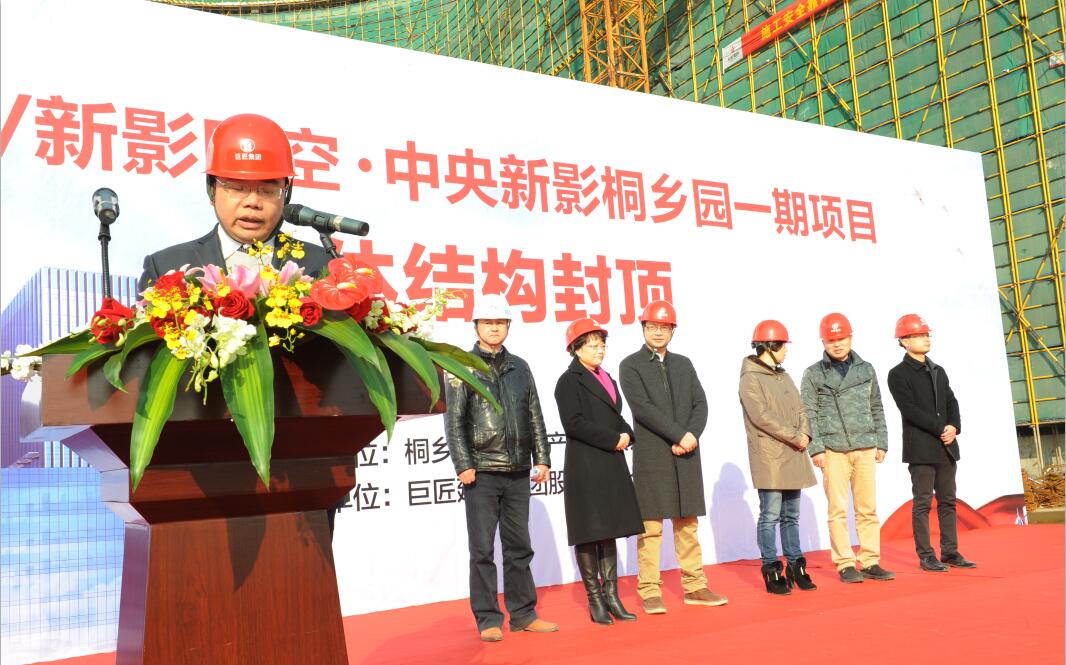 1月22日上午,我集團承建的CCTV新影時空·中央新影桐鄉園項目迎來了主體結構封頂儀式。桐鄉市市委常委、宣傳部部長、副市長潘敏芳等領導出席儀式,建設單位、施工單位等各方管理人員代表參加封頂儀式。我集團生產管理中心常務副總經理張為民代表巨匠發言,項目部負責人卜建祥進行表態發言。