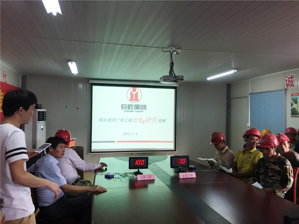 7月2日下午,桐鄉(xiāng)市旅游廣場工程會議室人頭撰動、掌聲不斷。這里正在舉行一場別開生面的安全知識競賽。參賽的選手全部來自施工一線的工人,參加比賽的各隊分別是泥工班組、木工班組、鋼筋工班組、架子工班組組成的四支隊伍組成。